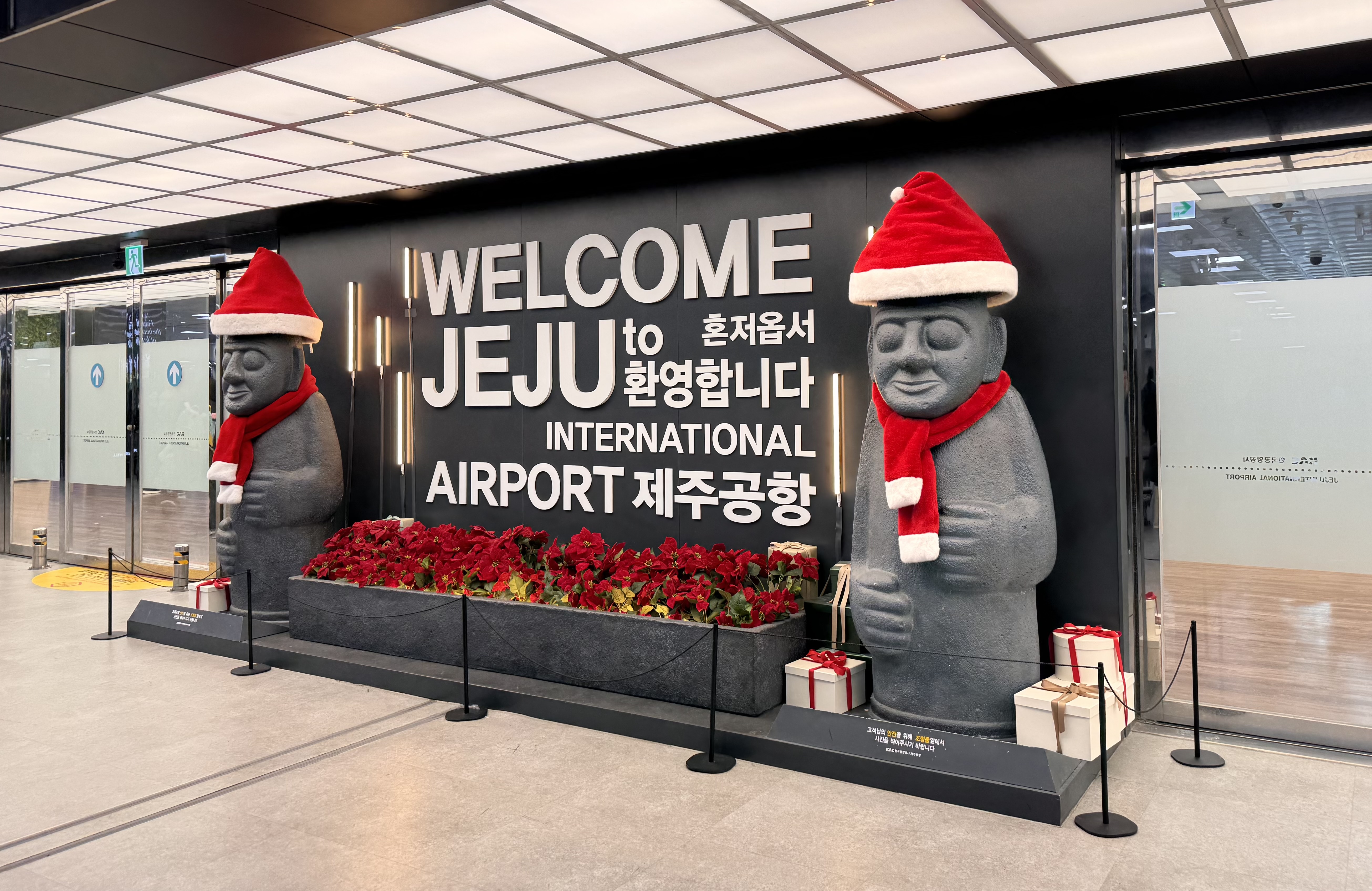 짐 찾고 바로 나가는 문 앞에 하루방님이 산타 복장을 하고 있어서 꽤 인기있는 포토스팟이 되었음